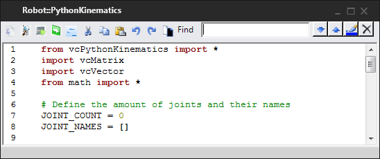 A Python Kinematics behavior allows you to define the forward and/or inverse kinematics of a Robot Controller for a robot using a script written in Python programming language.