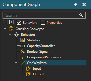 The ports of a One Way Path are listed with the behavior in the Component Graph panel.