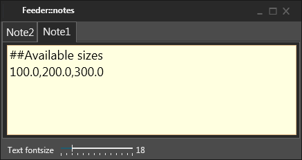 The editor displays each note in its own tab and text area. There is a global font size option that affects the size of text in all notes.