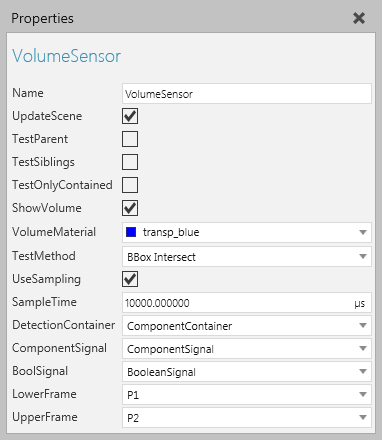 | VolumeMaterial | Defines the material of the sensor's volume space. Generally, a material with some transparency or Alpha channel is used in order to show the detection area and component that triggered the sensor. |