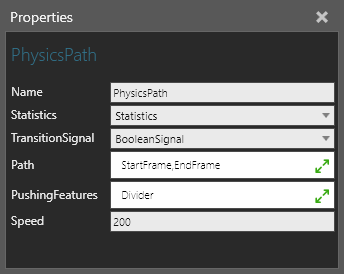 The node of a Physics Path requires at least one Physics Entity behavior. By default, any feature with a collider in the same component as the Physics Path will apply a pushing force. Objects are pushed in the direction of path. You can limit the pushing force by associating one or more features with the path.