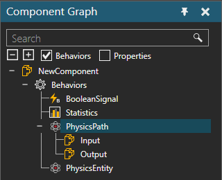 The ports of a Physics Path are listed with the behavior in the Component Graph panel.