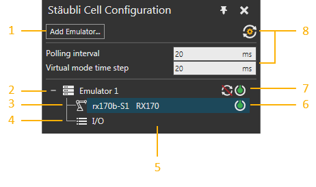 | Remove | Deletes the emulator from the Stäubli add-on. |