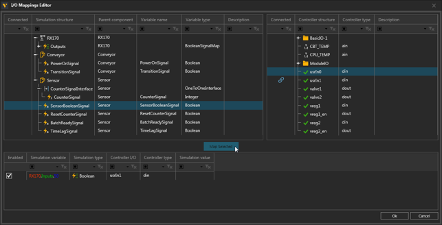- Select the simulation variables and physical I/O of controller you want to pair with each other.