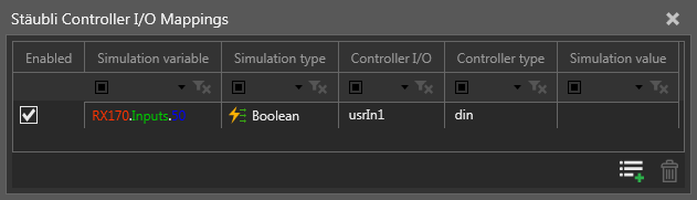 The I/O Mappings Editor allows you to pair/map simulation variables with the physical I/O of a controller for a selected emulator in the Stäubli Cell Configuration panel.