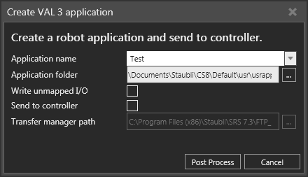 | Post Process Program | Opens the Create VAL 3 application task pane, thereby allowing you to create a VAL 3 application. |