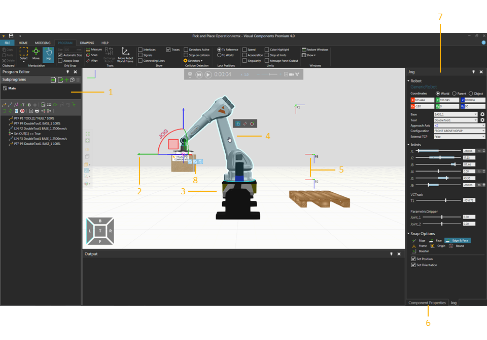 Jog Allows the pointer to jog and interact with the joints of robots and other components in 3D world as well as directly select a robot, and then use manipulator to teach robot.