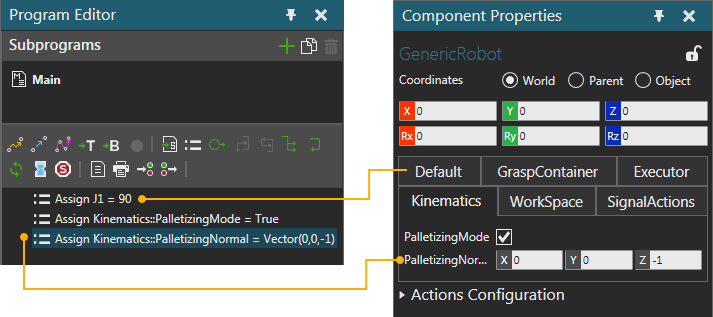 | from vcScript import * comp = getComponent() robotExecutor = comp.findBehaviour("Executor") robotProgram = robotExecutor.Program #find or create global counter in robot program counter = robotProgram.getProperty("counter") if not counter: counter = robotProgram.createProperty(VC_INTEGER, "counter") |