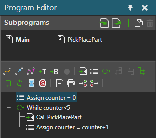 A program variable is a property and global variable of a robot program. You can add program variables using API. For example, you can add a global counter variable to a vcProgram object and use it in the Main routine and subroutines of that program.