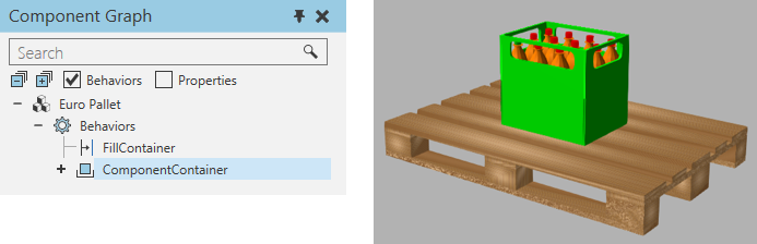 In some cases, you may need to use scripting to define routing rules and logic for handling dynamic connections, for example a conveyor with multiple entry and exit points. In other cases, scripting is needed to grab and release components from static containers, for example the storage and retrieval of component from racks.