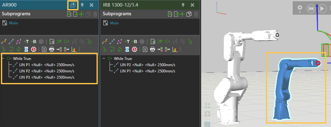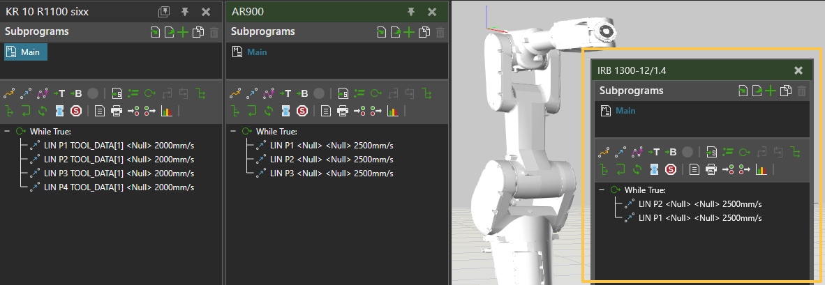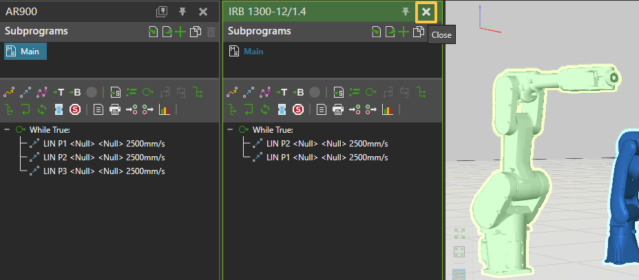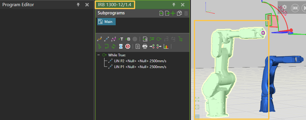 You can use the Multiprogram Editor feature to pin multiple instances of the Program Editor in the PROGRAM tab, allowing you to program multiple robots simultaneously. To pin the Program Editor panel for the currently active robot, use the Pin active Program Editor button.
