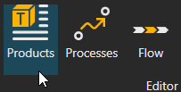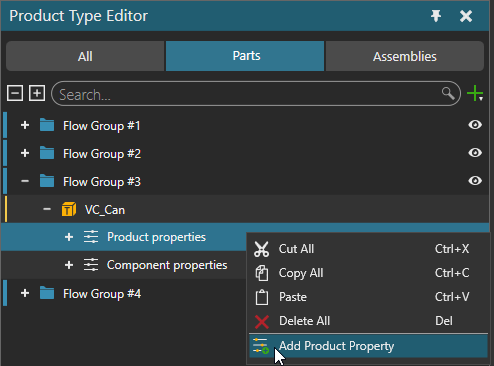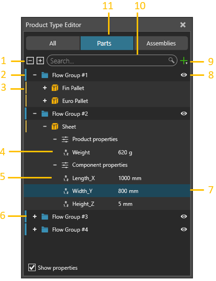 The Product Type Editor panel shows the product types and the assemblies created for the layout. The panel allows you to add and edit types and assemblies of products and arrange them to flow groups. You can also define properties for the product types and assemblies.