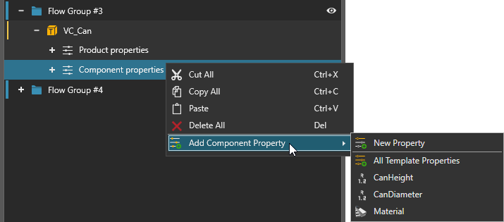 Be aware that product properties are not listed in the Properties panel of the selected dynamic component. However, they can be accessed with statements of a process routine or APIs.