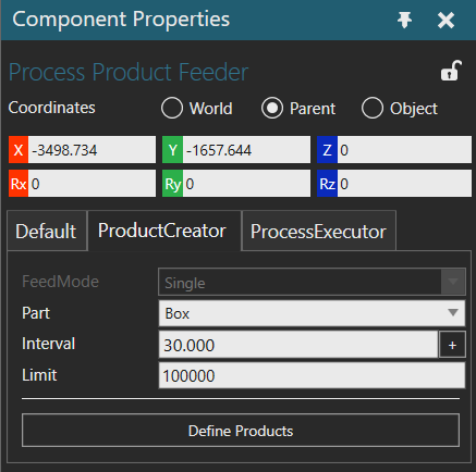 A Product Creator is a behavior that allows a component to create product instances from product types during simulation. Thus, you can use a component having this behavior in order to create product instances in simulation defined in Product Type Editor panel. From eCatalog’s Visual Components Public Models, you can use Source Process component as a stationary feeder or Product Feeder component as an inline feeder.