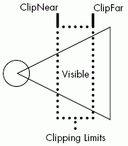 0 = VC_RENDER_CLIPPING_AUTOMATIC 1 = VC_RENDER_CLIPPING_CLASSIC 2 = VC_RENDER_CLIPPING_MANUAL Classic is the default setting for the application. Automatic tries to keep all objects in view of a camera visible. Manual allows a user to specify the near and far distances for clipping. Manual mode uses ClipNear and ClipFar properties to define a clip-volume space of a camera's projected view. Objects within the area defined by ClipNear and ClipFar are displayed based on a camera's center of interest and eye settings. Example. Clipping a camera's perspective view