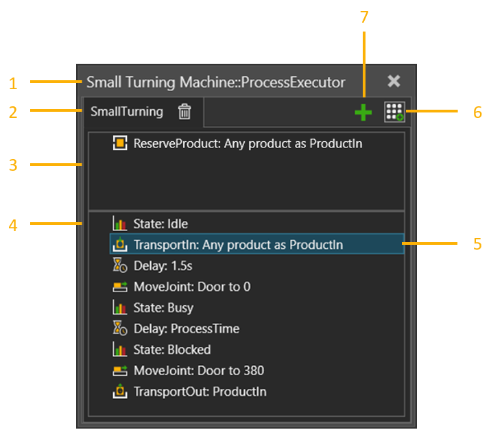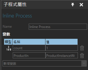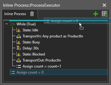 請注意,程序常式還可以包含執行階段變數,例如 ProductIn 表示該程序中的產品。執行階段變數根據必要的不同陳述建立,並在模擬復位時自動刪除。