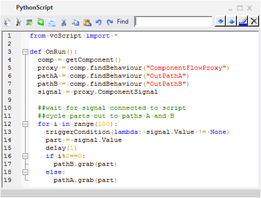 在有些情况下,您可能会需要使用脚本编写以定义处理动态连接的排程规则和逻辑,例如,拥有多个进入和退出点的传送带。在其它情况下,需要脚本编写以从静态容器抓握和释放组件,例如,从机架存储和提取组件。