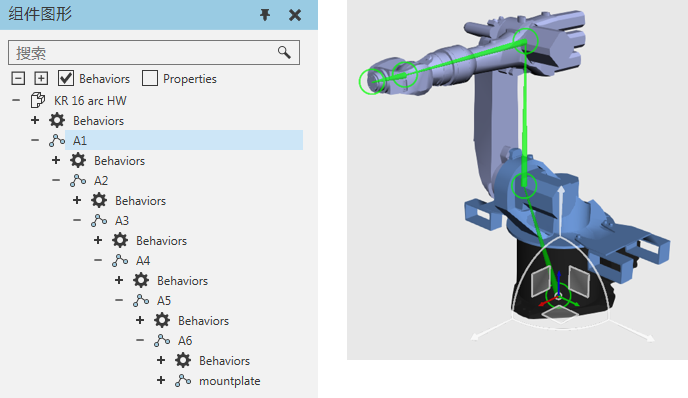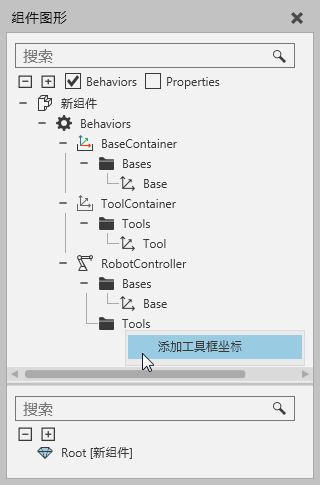 在使用基坐标和工具坐标框时,您需要使用组件图板和快捷键编辑有些机器人类型行为的基坐标和工具元素。通常来说,在拥有机器人控制器的组件中,您不需要使用基坐标和工具容器,因为该行为拥有其自己的基坐标和工具坐标收藏。