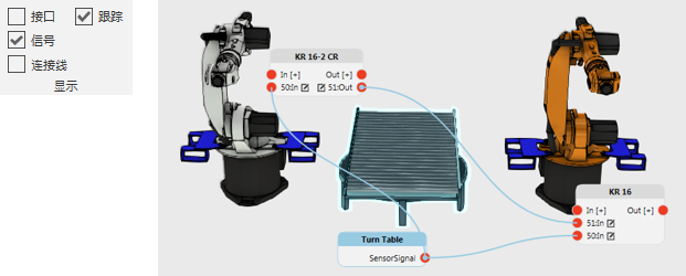 若要连接信号至机器人I/O端口,启用信号开关,而后使用机器人及其它组件的连接编辑器以将信号相互连接。