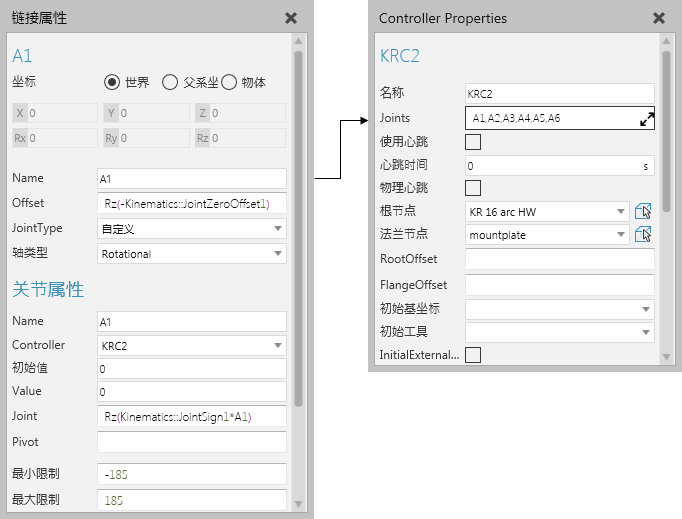 在节点中对关节进行定义,而后指定给一个机器人控制器。关节在被指定及受机器人或者伺服控制器驱使时,会自动向关节添加额外的属性。在定义关节时,您可能会想要参考机器人控制器使用的运动属性以及组件中的其它属性。例如,矢量属性常常用于定义关节偏差的量级/长度。