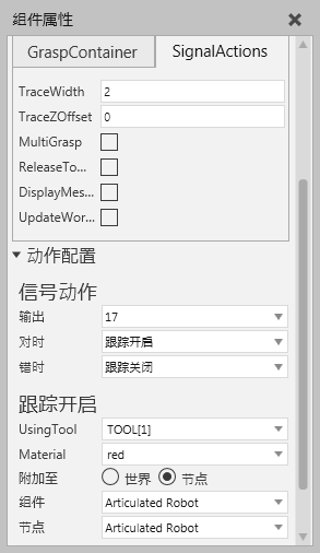 为了让动作信号能够起作用,机器人必须拥有一个动作脚本行为。通常来说,您不需要编辑动作信号,但是应该编辑映射后的工具坐标框的位置,而后添加所需的动作至机器人程序。在所有情况下,您都绝不会需要手动编辑动作脚本行为的脚本属性,建议仅使用属性面板中的动作配置编辑器。