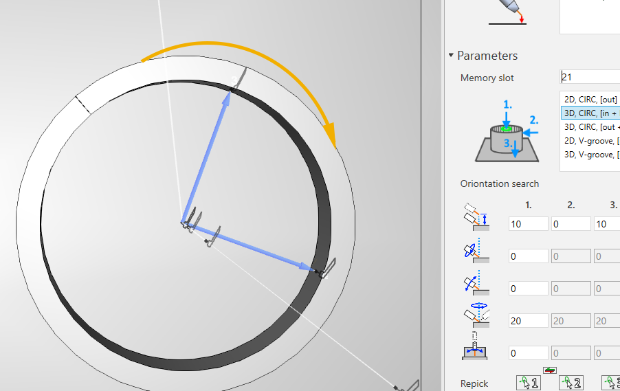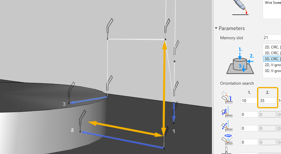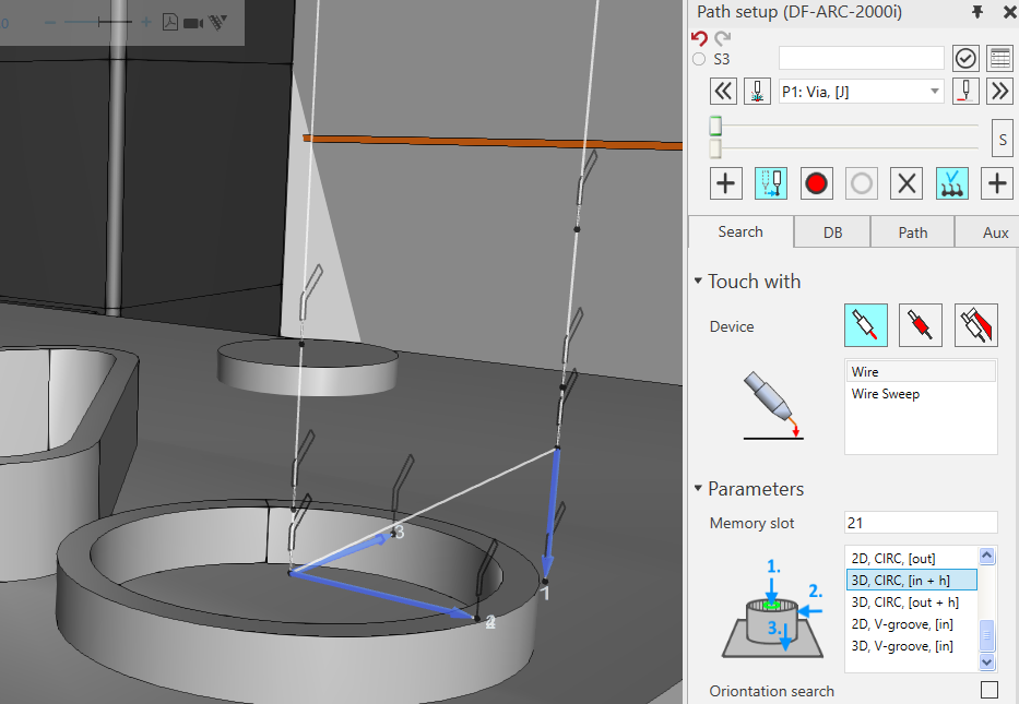 - 在“搜索路径设置”选项卡中,您可选择环形搜索的类型。可根据焊缝选择 2D.CIRC[IN]、2D.CIRC.[OUT]、3D.CIRC.[in+h] 或 3D.CIRC.[out+h] 。