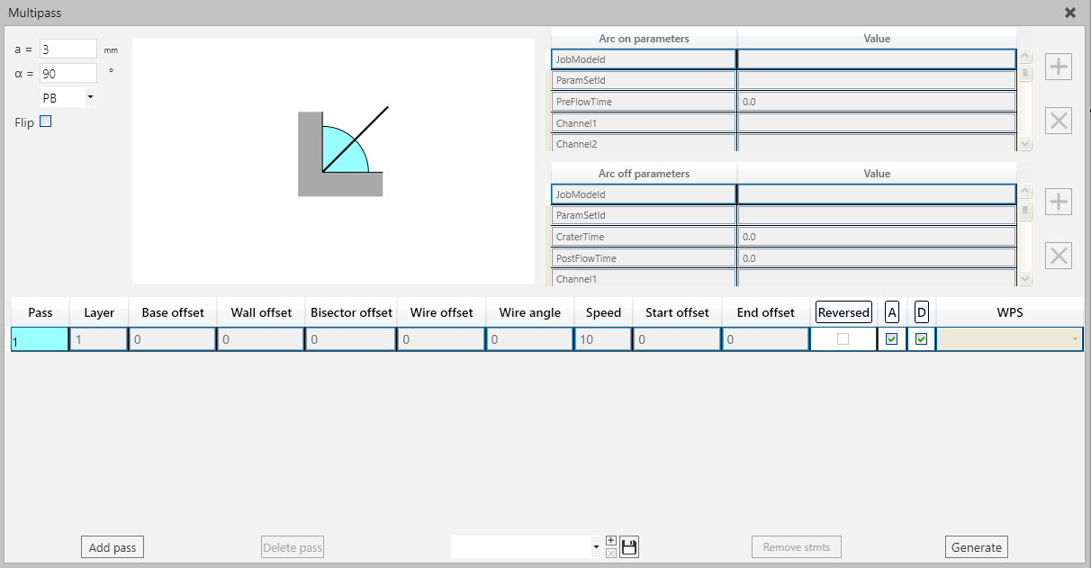 - 在多焊道表中,您可修改每条焊道的参数: 焊层、底部偏移、墙面偏移、等分线偏移、焊丝偏移、焊丝角度、速度、起点偏移、终点偏移、方向翻转和 WPS