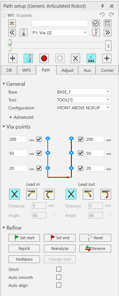 - 通过点、接近点、靠近点、远离点、出发点、过孔点:可以通过取消选中将这些点从路径中删除。可以修改到下一点的距离(接近焊缝时)或到上一点的距离(离开焊缝时)。