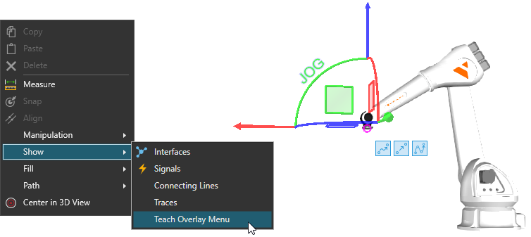 “快速机器人教学”可以让您使用“教学叠加”菜单中的动作,在机器人程序中创建语句。这样做的好处是机器人位置的快速教学,以及简化了在3D世界中对机器人编程的工作流程。