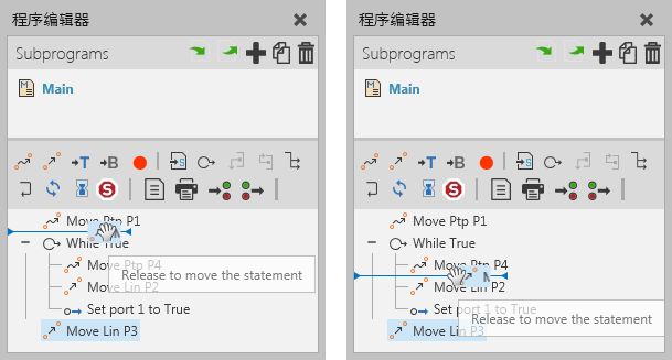 机器人的程序是它的工作,与机器人一同保存在布局中。若需要重新排列程序中的语句,请将语句拖放至另一个语句之前或者之后。您输入语句的位置以一条线表示,这条线也会指明您插入语句的等级。