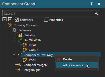 The ports of a Component Flow Proxy are added and removed using shortcuts and listed with the behavior in the Component Graph panel.