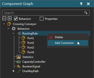 Shortcut: In the Component Graph panel, right-click a Routing Rule behavior, and then click Add Connector. |