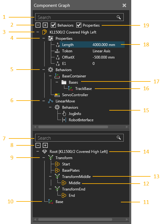 The structure of a component is a tree containing nodes. At the top of the tree is the root node of a component, which contains component properties. Other nodes are linked together and formed under the root node. Each node contains its own collection of behaviors, which are listed with a node in the tree. Some behaviors have sub-elements that perform special actions or contain other elements. For example, some behaviors have ports that allow the internal and external transfer of components between behaviors, whereas other behaviors have containers for other types of data. With the exception of the root node, each node defines its own joint, offset and mechanism for movement using the Properties panel.
