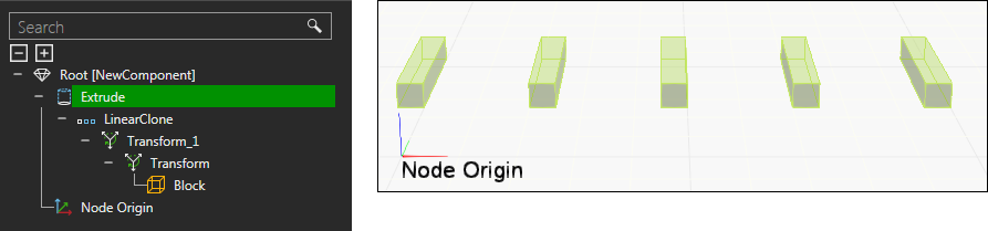 Feature tree evaluation is an important modeling concept and is illustrated in the following example. A Block feature is added to a node, transformed along the X-axis, and then transformed around the Z-axis relative to the operation, thereby using a radius and angle to manipulate the location of the Block. Next, the Block is cloned along the X-axis of an operation, and then extruded along the Y-axis of another operation. Finally, the Node Origin frame and hierarchy the Block belongs to is passed to the Root feature of its node.