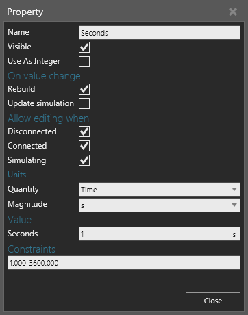 Component properties can be referenced within the scope of a component to assign values and write expressions. This allows you to make the geometry of a node and other properties parametric. Depending on the type of property, you can assign a quantity and unit prefix to a property, which will automatically be based on the global Unit Family setting.