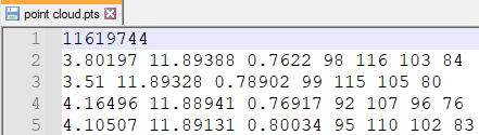 - Die Einheit der Positionen der Punkte in einer Punktwolkendatei wird in Metern gelesen, es sei denn, die erste Zeile der Punktwolkendatei enthält die Gesamtzahl der Punkte; dann werden Millimeter verwendet.