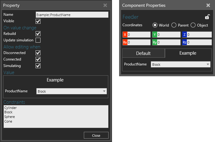 When you select a property in the Component Node Tree, a Property task pane is displayed and is used to edit that property. Depending on the type of property, you can set constraints by using a dash (-) for a min and max range, a semi-colon (;) for a set of values, and a line break for each string of characters. The name of property can be used to generate a property tab in the Component Properties panel. The syntax is <tabname::propertyname> and the tab will be displayed if at least one property using that tab name is visible and not hidden in a component.