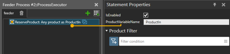 A Reserve Product statement is a requirement statement that allows you to create a requirement for a matching product to be available. Multiple of these reservations can be used in same process. Reserved product can be any or filtered by product types or flow groups. Statement stores product instance to variable which name is defined by ProductVariableName.