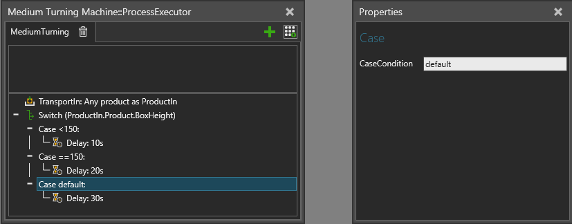One of the cases may be specified as the default case, which will be executed if no other case condition is accepted. This is done by typing "Default" into the case condition (not case sensitive).