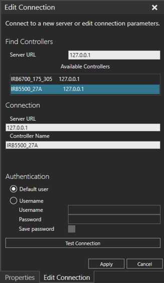 Für eine ABB-Roboter-Plugin-Verbindung sind die IP-Adresse und der Name des Roboter-Controllers erforderlich. Standardmäßig ist dies der Host-Rechner (localhost). Es gibt auch eine „Controller finden“-Funktion, die verwendet werden kann, um Controller im lokalen Netzwerk zu finden (nur physische Controller). Sie erfordert auch den Authentifizierungstyp (DefaultUser oder ein anderer im UAS (User Authorization System) des physischen Roboter-Controllers definierter Benutzer).