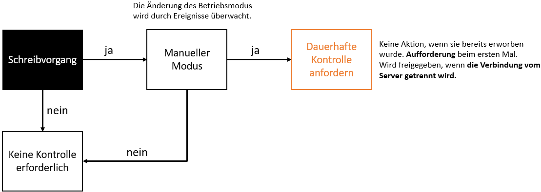 Bei der Betriebsart „Manuell“ ist eine dauerhafte Kontrolle erforderlich, d. h. die Kontrolle wird beim ersten Schreibvorgang angefordert und erst wieder freigegeben, wenn die Verbindung zum Server unterbrochen wird. Signale erfordern im manuellen Modus Kontrolle für Schreibvorgänge.