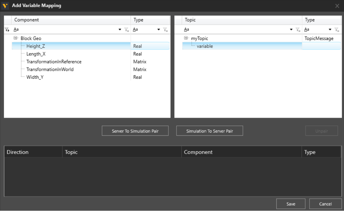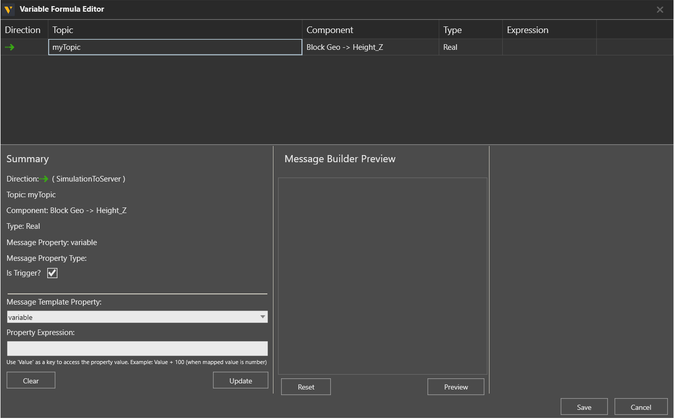 SimulationToServer-Variablenpaare enthalten eine Ist Auslöser?-Eigenschaft, die definiert, ob eine Änderung des Variablenwerts die Veröffentlichung einer Nachricht auslöst.