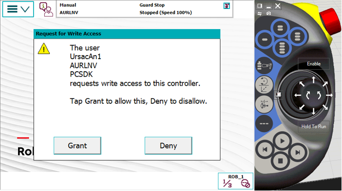 After the dialog, a similar message as below will appear on the FlexPendant, so to grant write access.