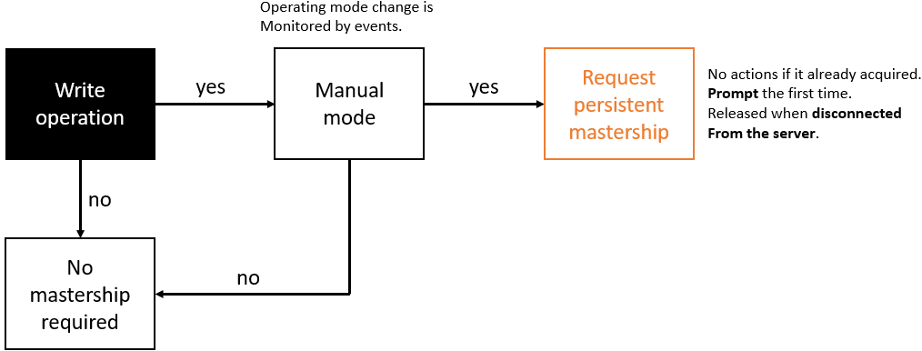 If the operating mode is Manual, then persistent mastership is required, meaning that the mastership is requested at the first write operation, then released only when the server is disconnected. Signals require mastership in manual mode for writing operations.