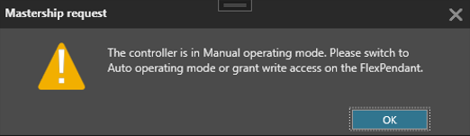 The user is prompted with a Mastership request dialog, informing that the controller needs to either be switched to auto operation mode, or grant write access from the FlexPendant.
