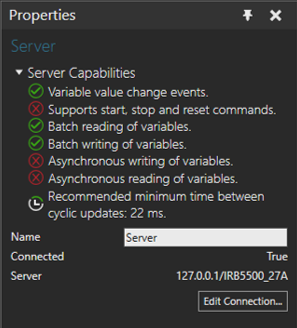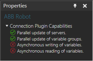 You can verify the capabilities of the ABB Robot plugin and subsequent server connections in the Properties panel.