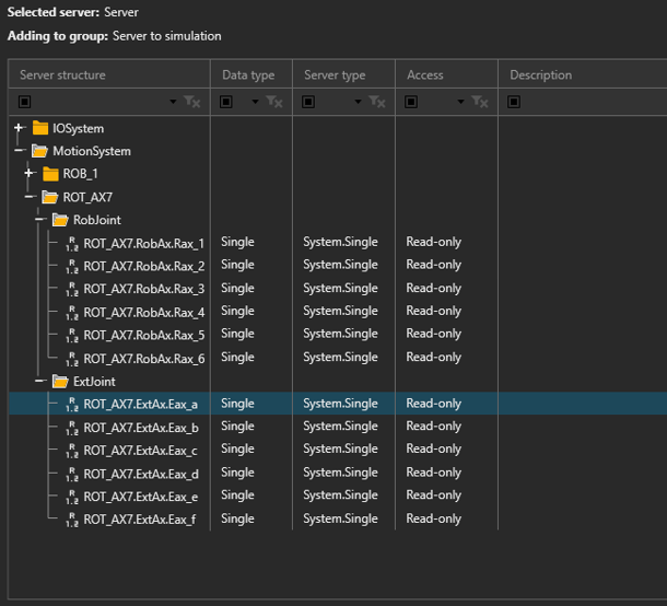 The browsing functionality presents the variables in a convenient hierarchical folder structure, and creates child variable nodes for each signal and for each joint value of all mechanical units in a controller.