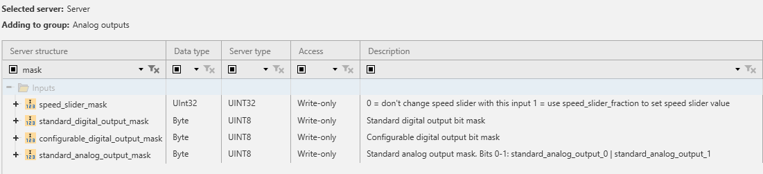 Four inputs to controller have separate mask variables. These masks act as a filter for applying the values sent by the client. The idea is that the RTDE client does not necessarily want to overwrite all bits in, for example, the variable that controls the "standard digital outputs" of the robot. This allows control over some bits of a variable from the robot program on the controller and some from RTDE clients. These masks create some limitations for using the input variables in Visual Components Premium 5.0.
