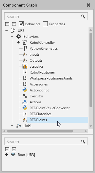 Important: The robot RTDE interface variables use radians as the unit for angles in variables, for example current and target joint values. This means they cannot be directly paired to Value properties of DOF objects in the UR robot components. To workaround this issue, UR robot components available in the eCatalog panel have been modeled with a "RTDEJoints" string signal behavior, which can be mapped to the "target_q" output variable in the controller. A script in the robot is used to receive events from that signal, parse its value, and use immediate movements to jump the robot component to the received pose.