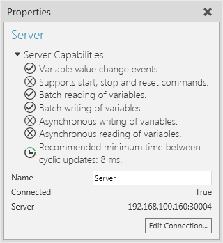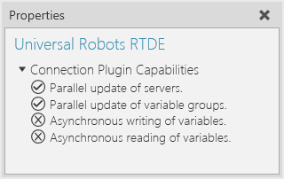 You can verify the capabilities of the Universal Robots RTDE plugin and subsequent server connections in the Properties panel.